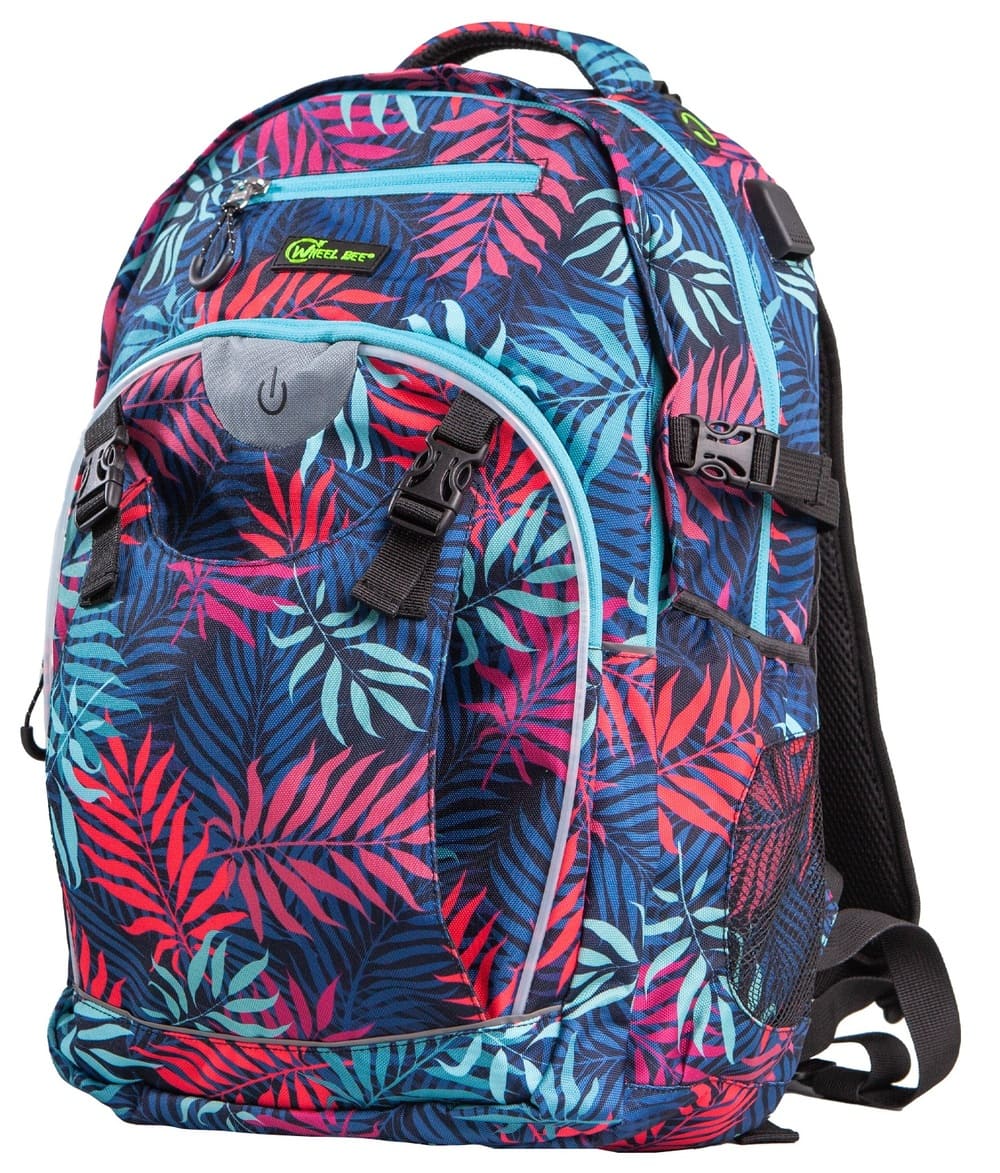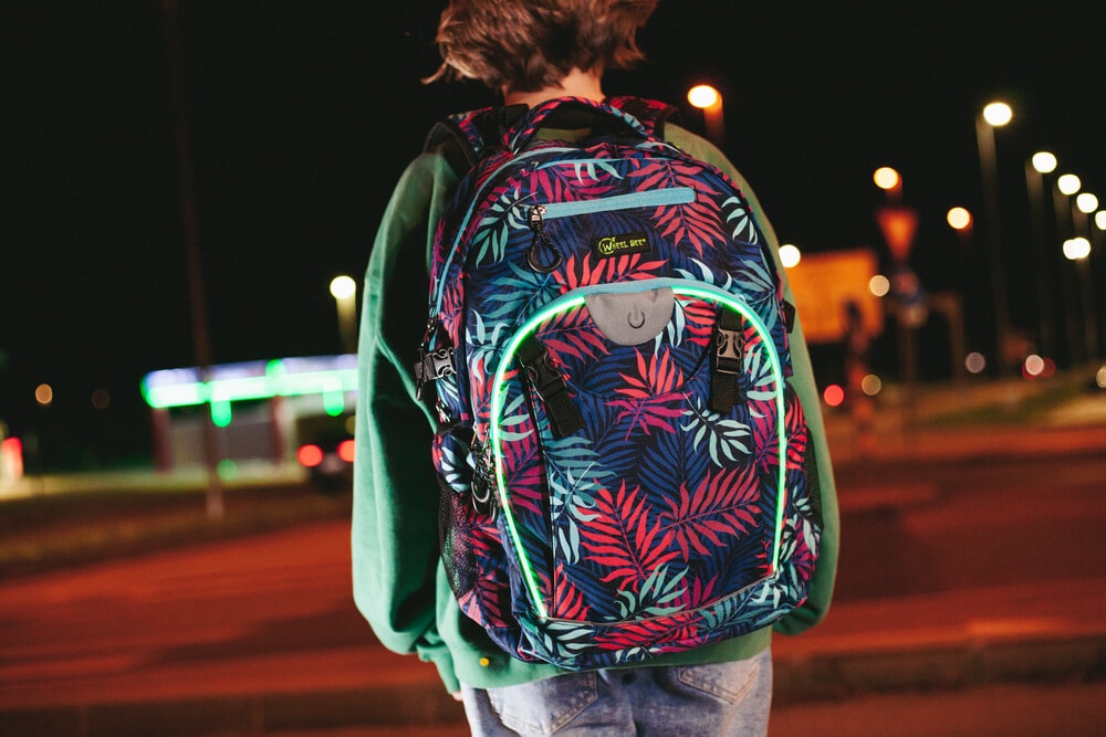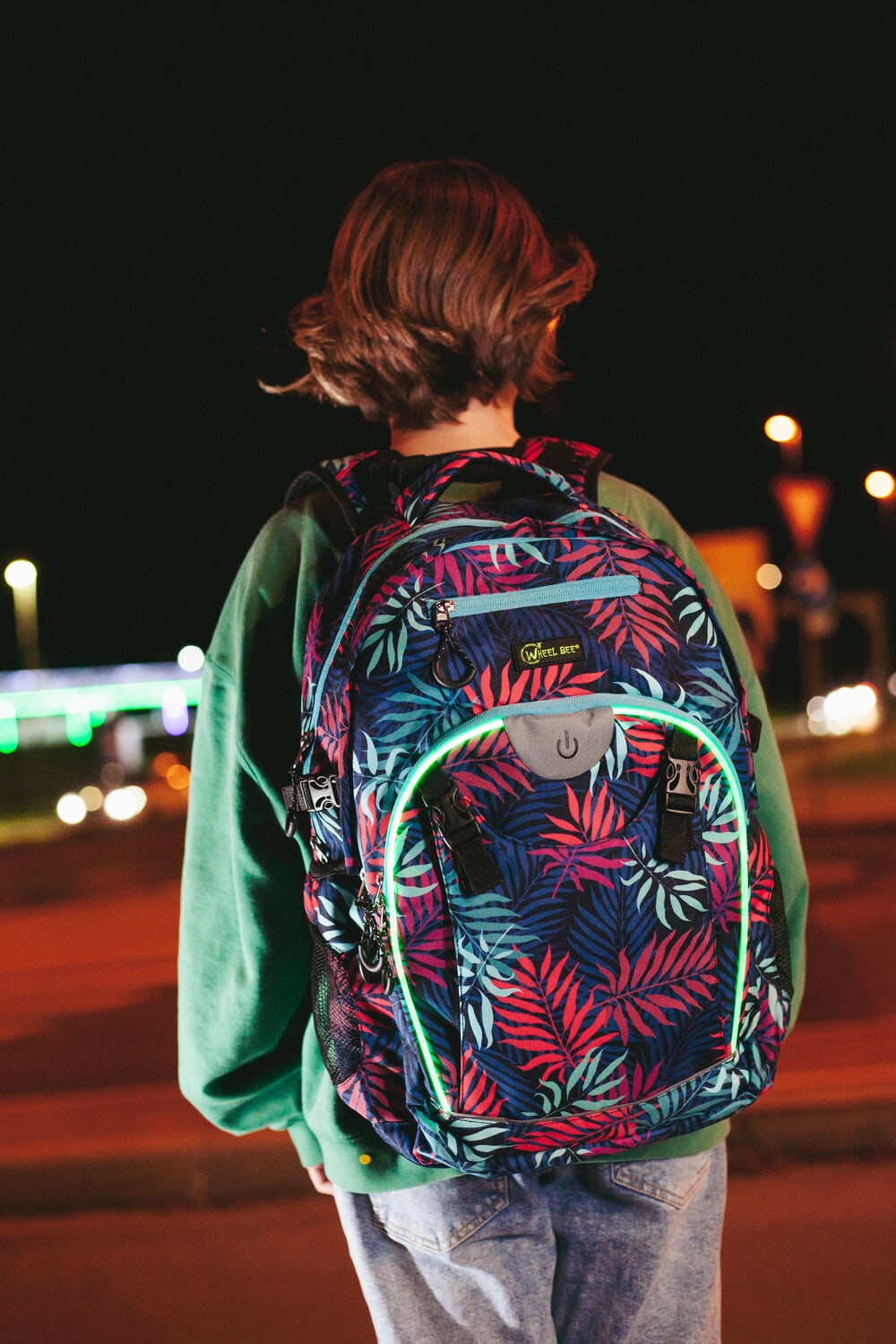 Features: INTEGRATED LED LIGHT for increased visibility and safety | USB PORT with cable | Headphone exit | Reflective stripes | Quality SBS zippers | 3 large departments, 1 smaller department, 3 hidden »theft-safe« pockets | Lap top department | 2 Powerbank pockets | Accessories organizer | Hard and padded back with air circulation system | Padded bottom | Padded shoulder straps | Height adjustable shoulder straps | Reinforced backpack holder | Waist straps | Chest straps with SAFETY WHISTLE | Skateboard/ clothes holder pocket | Clothes side straps | Side pockets | Easy zipper handler