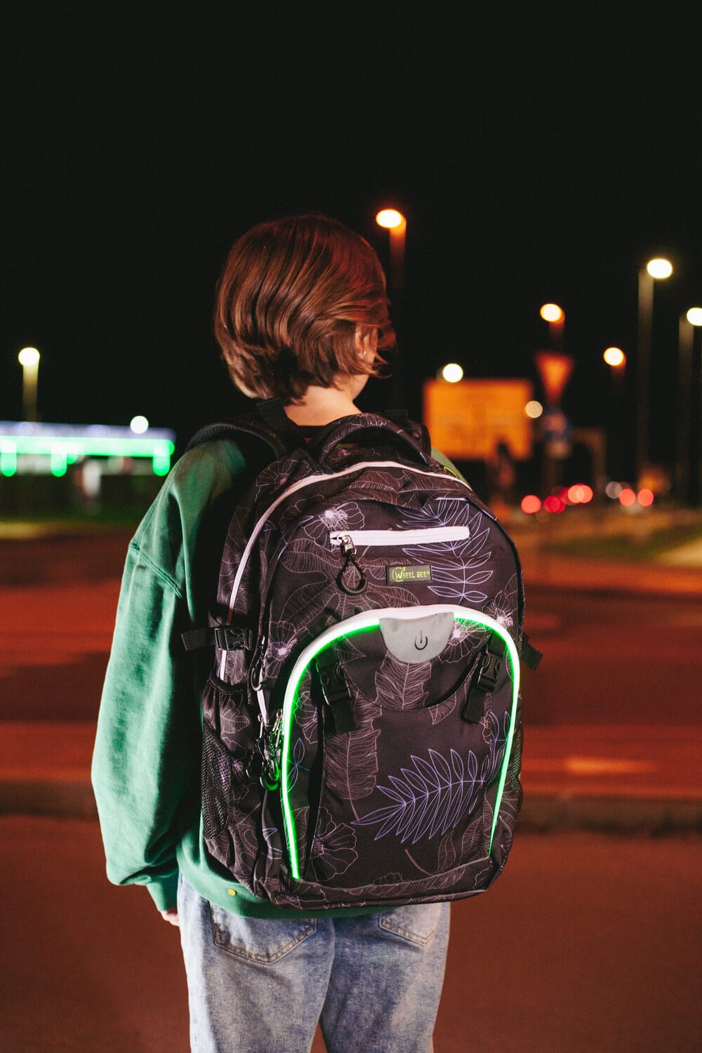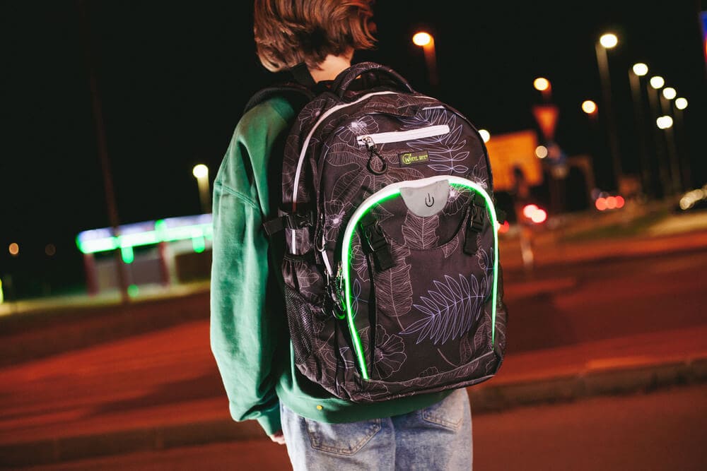 Innovative backpack with LED light integrated for increased visibility and safety.